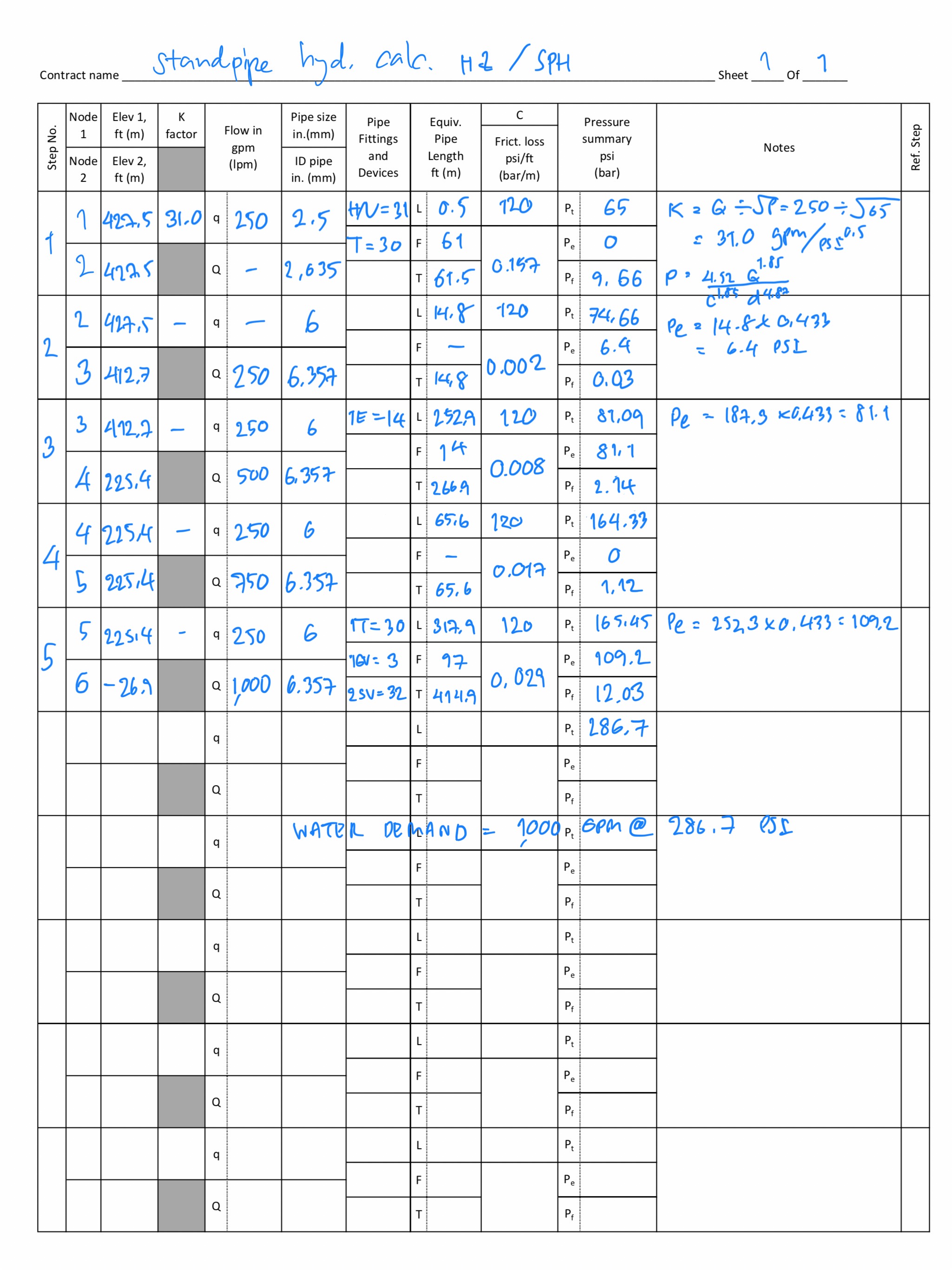 เมื่อรวบรวมข้อมูลครบถ้วนแล้ว เริ่มจาก หัวจ่ายน้ำดับเพลิงชั้นบนสุดที่จะต้องฉีดน้ำได้ 250 GPM ที่ความดันใช้งาน 65 PSI ตามกฎหมายไทย ดังนั้นเราจะคำนวณค่า K = Q/P^0.5 = 250/65^0.5 = 31.01 gpm/PSI^0.5 ดังนั้นที่ปลายสายของชั้นบนสุดจะฉีดน้ำ 250 GPM ที่ความดันใช้งาน 65 PSI และเริ่มคำนวณตามขั้นตอน โดยคำนวณหาค่าความต้านทานการไหลต่อความยาว จาก สูตร p = 4.52*Q^1.85 / C^1.85/ d^4.87 รวมค่าความยาวท่อ และความยาวสมมูลท่อที่คิดจากข้อต่อ (อย่าลืมคิดความยาวสมมูลของ Hose valve ด้วย) แล้วคำนวณหาความดันที่ลดลงจากความยาวท่อที่จะต้องเพิ่มให้ระบบ และ ความดันที่จะต้องเพิ่มจากความสูงของท่อที่สูงขึ้น (รายละเอียดศึกษาเพิ่มเติมจาก วสท.3002-51 หรือมาตรฐาน NFPA13 หรือ 14 หรือ Youtube) เมื่อถึงจุดต่อที่ต้องฉีดน้ำเพิ่มก็รวมอัตราการไหลเพิ่ม และคำนวณไปเรื่อยๆ จนถึงจุดที่ต่อกับเครื่องสูบน้ำดับเพลิง ก็จะได้อัตราการไหลและความดันที่ต้องใช้ในการส่งเข้าไปในระบบท่อยืน เพื่อให้ได้อัตราการไหลและความดันที่ต้องการ ที่เรียกว่า ค่าความต้องการปริมาณน้ำดับเพลิง (Water demand)